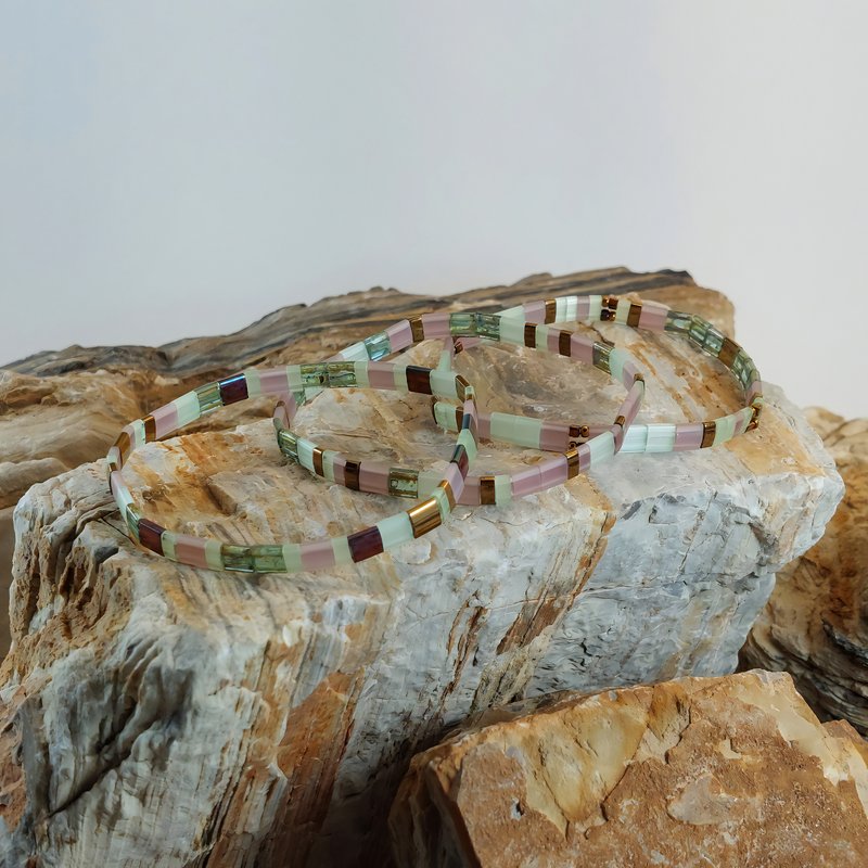 Le DOUCE, notre bracelet de perles plates RE•VE Originel™ est un bijou raffiné et élégant, conçu pour sublimer votre style quotidien. Fabriqué à la main en France avec des perles plates authentiques Miyuki du Japon, ce bracelet présente une palette de couleurs douces et harmonieuses, mêlant des tons de vert, violet avec des accents dorés et bronzes.