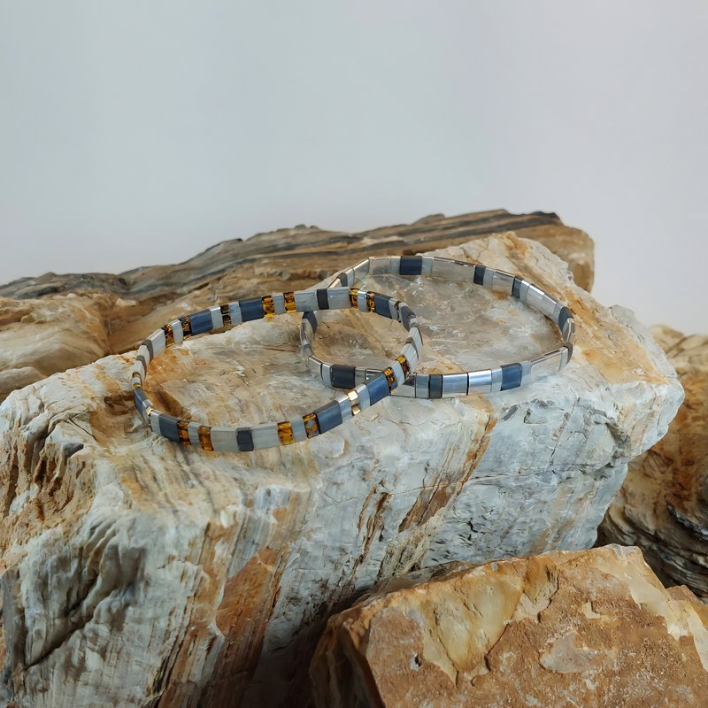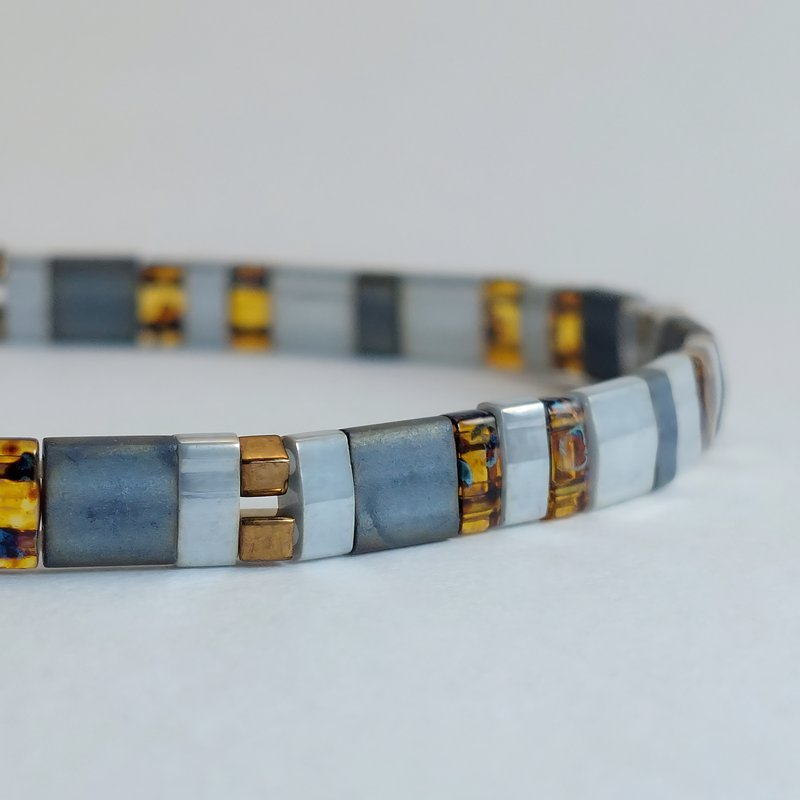 Le FIERT – Bracelet de perles RE•VE Originel™ est un bijou unique et raffiné, fabriqué à la main en France avec des perles plates authentiques Miyuki du Japon. Ce bracelet présente une combinaison de tons gris, bronze et ambre, créant un look élégant et moderne.