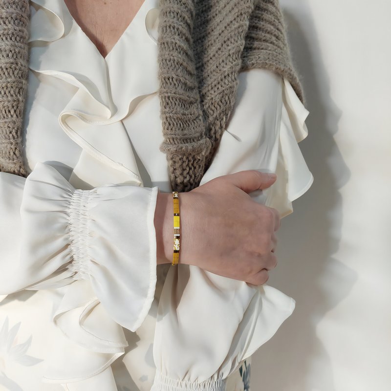 L’allure commence par un détail. Le FORSY – Bracelet de perles plates RE•VE Originel™ combine des jaunes citron, moutarde et ocre, des touches blanches marbrées et des reflets dorés pour capter la lumière sans en faire trop. Fabriqué à la main en France avec des perles plates Miyuki, il s’enfile instantanément grâce au fil élastique et se fait oublier au porté, tout en signant un style raffiné.