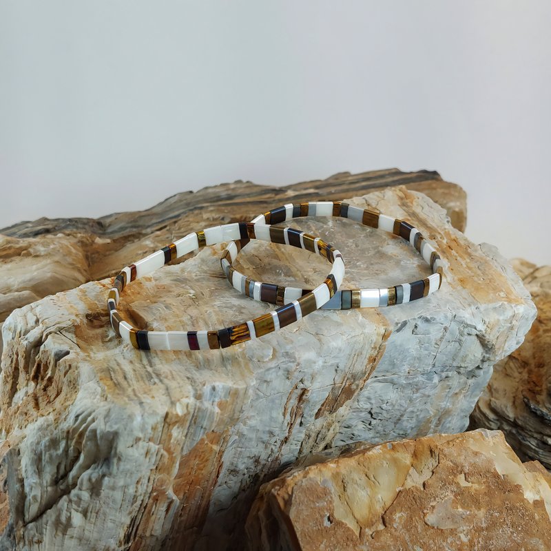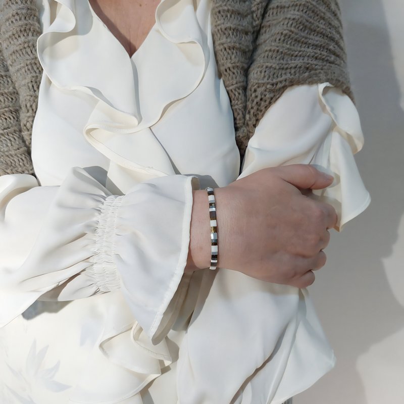 Attirez les regards avec le GAOS – Bracelet de perles plates RE•VE Originel™, une composition graphique de blanc, gris nuancés, brun cuivré et bronze qui capte la lumière. Son style raffiné se glisse aussi bien sur une tenue casual que sur une chemise de rendez-vous.