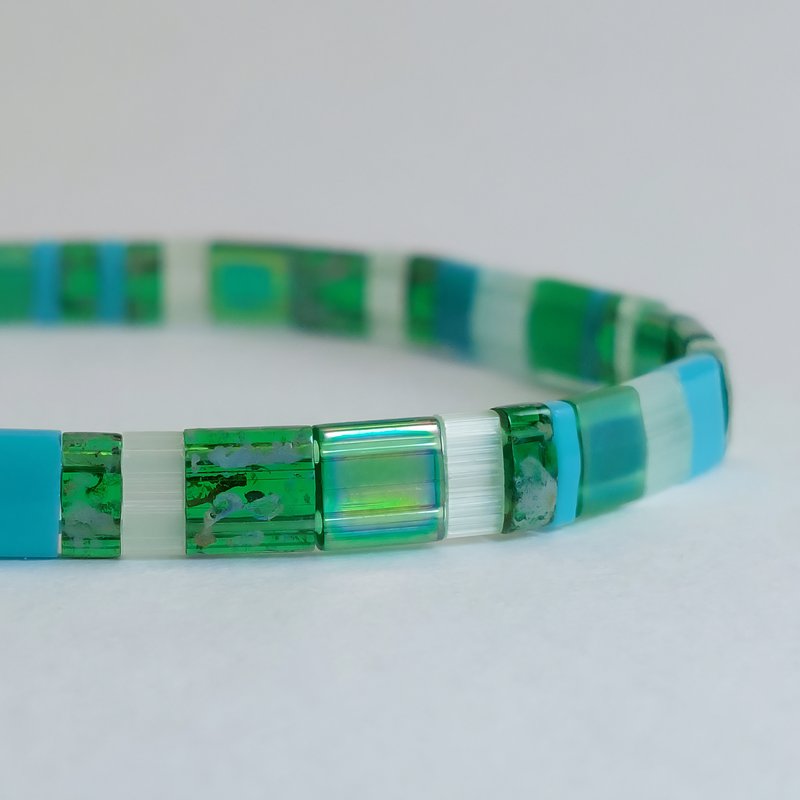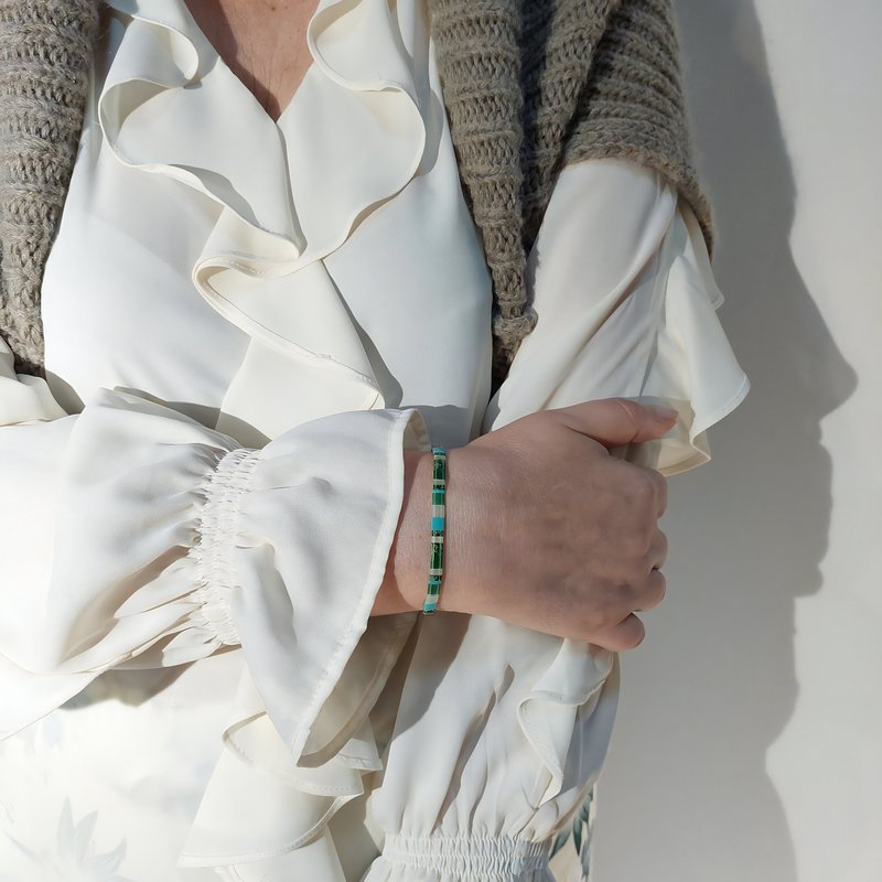 Jeu de transparence et d’éclat, HELIOS – Bracelet de perles plates RE•VE Originel™ mêle verts lumineux et turquoise vif. Les perles plates en verre dessinent un ruban de fraîcheur immédiatement raffiné, qui rehausse vos tenues claires comme vos looks plus contrastés.