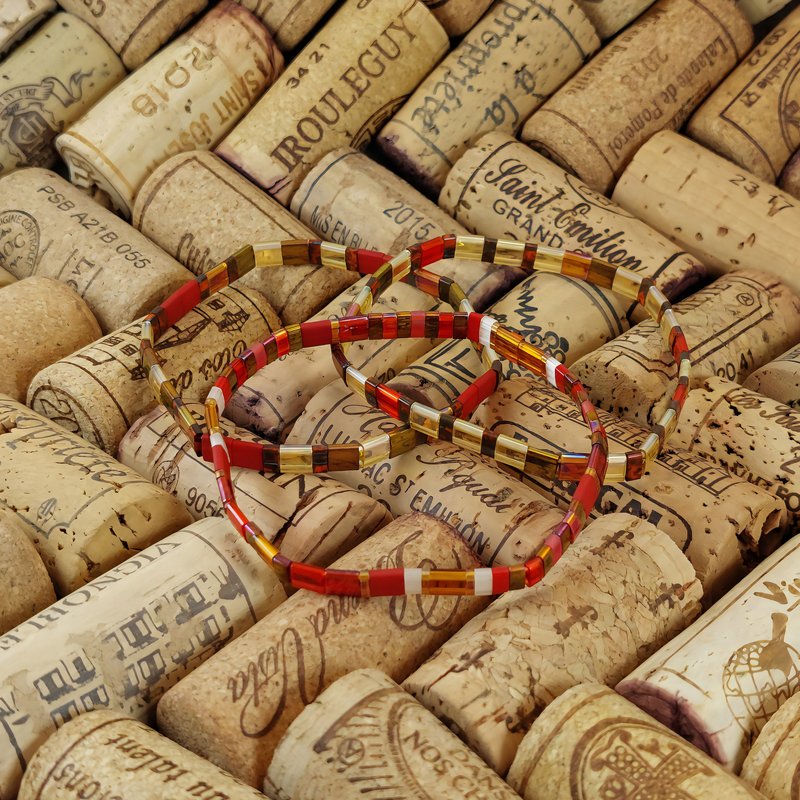 Le PAULA – Bracelet de perles plates RE•VE Originel™ mêle rouges intenses, reflets orangés, éclats dorés et transparences crème pour accrocher la lumière avec un charme élégant. Chaque pièce est réalisée à la main en France avec des perles plates Miyuki, reconnues pour leur éclat délicat.