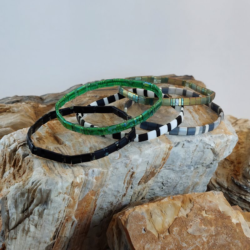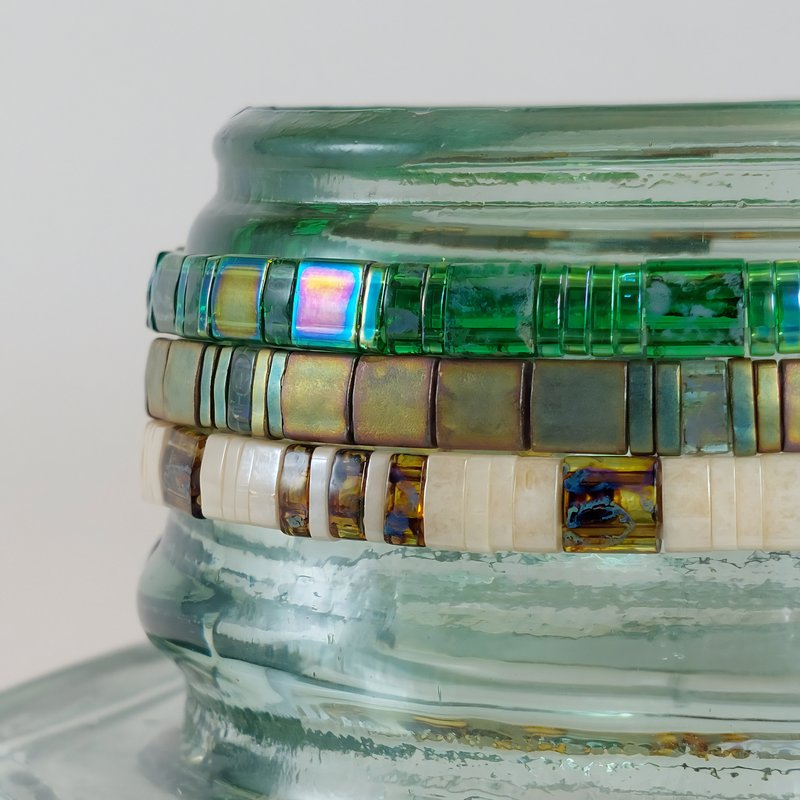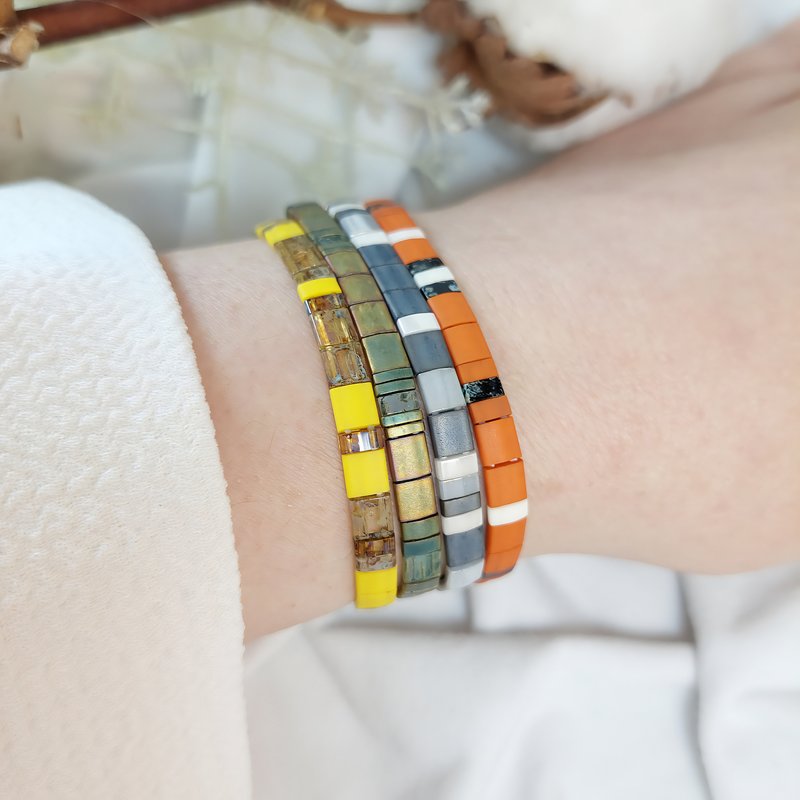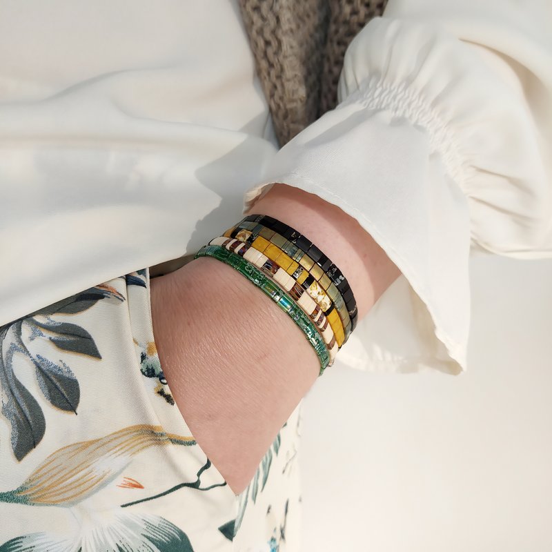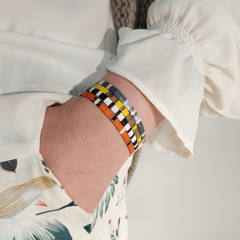 Chaque bracelet est entièrement façonné à la main en France, à partir de perles plates Miyuki en verre. Grâce au fil élastique, il s’enfile en un geste et reste agréable toute la journée, idéal si vos activités s’enchaînent. Porté seul, il signe un accent de caractère; en accumulation, il compose un style polyvalent et personnel.