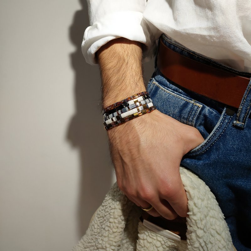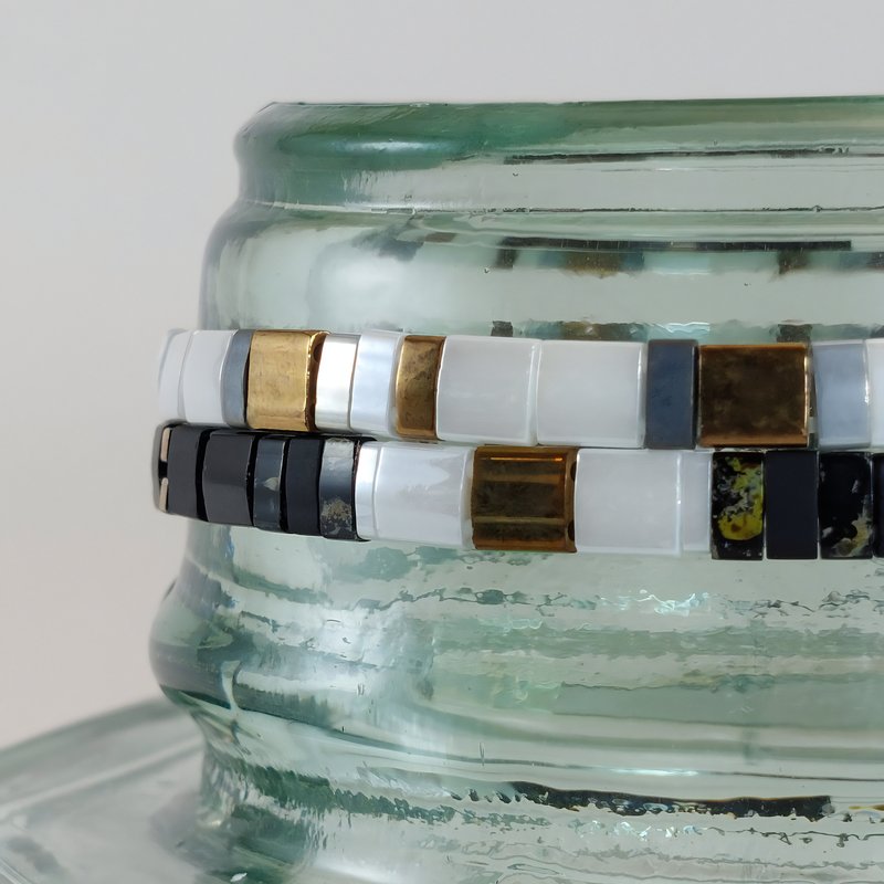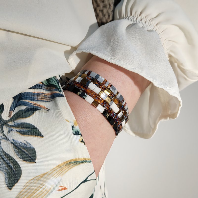 Pensés pour la vraie vie, ces bracelets sur fil élastique se glissent au poignet en un clin d’œil, restent agréables toute la journée et se combinent à une montre ou à d’autres bijoux pour un mix & match polyvalent. Le travail artisanal français valorise la beauté des perles plates Miyuki en verre et leur éclat durable.