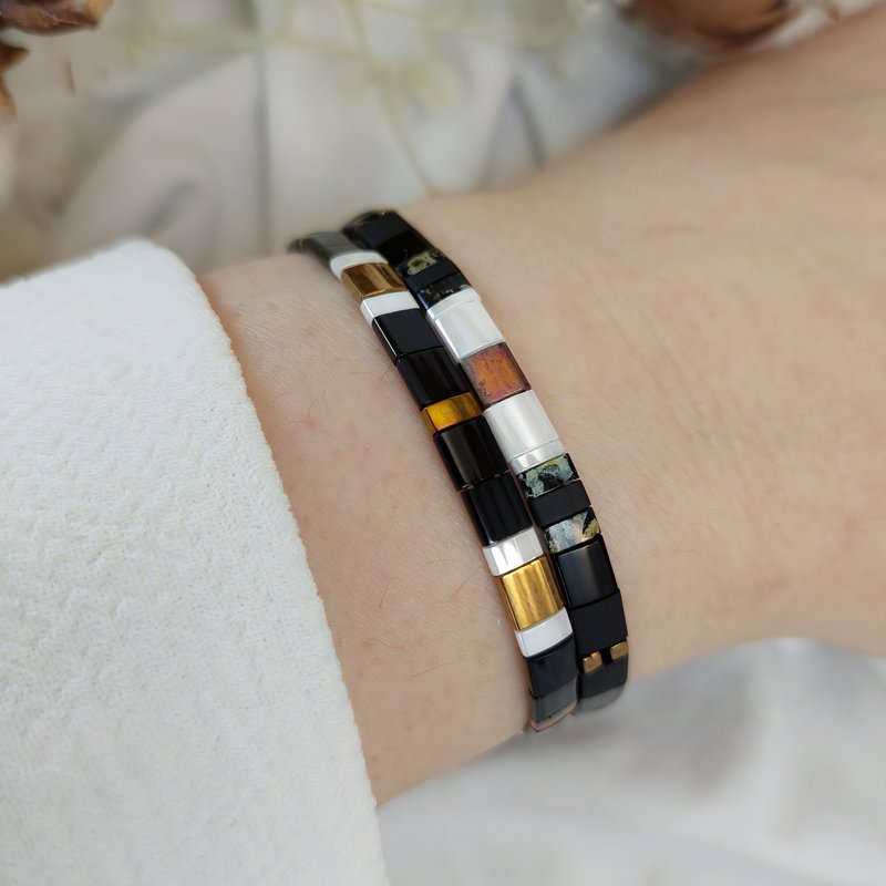 Fabriqués à la main en France avec des perles plates Miyuki en verre, ils se marient facilement à une montre ou à d’autres bijoux pour un mix & match polyvalent et intemporel. Livrés dans un pochon en coton biologique, ils sont prêts à offrir.