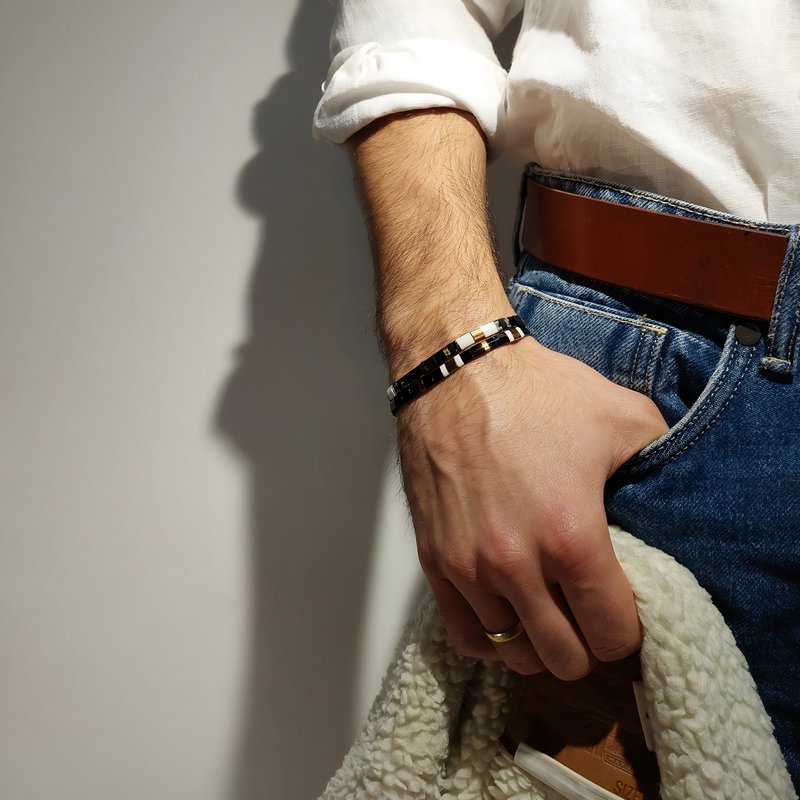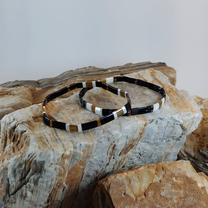 Affirmez votre allure avec l’ensemble APOLLON – Bracelets de perles plates RE•VE Originel™. Le dialogue entre noir profond, blanc opalin et reflets doré et bronze crée un contraste élégant qui structure le poignet et rehausse une chemise blanche, un costume décontracté ou une robe noire.