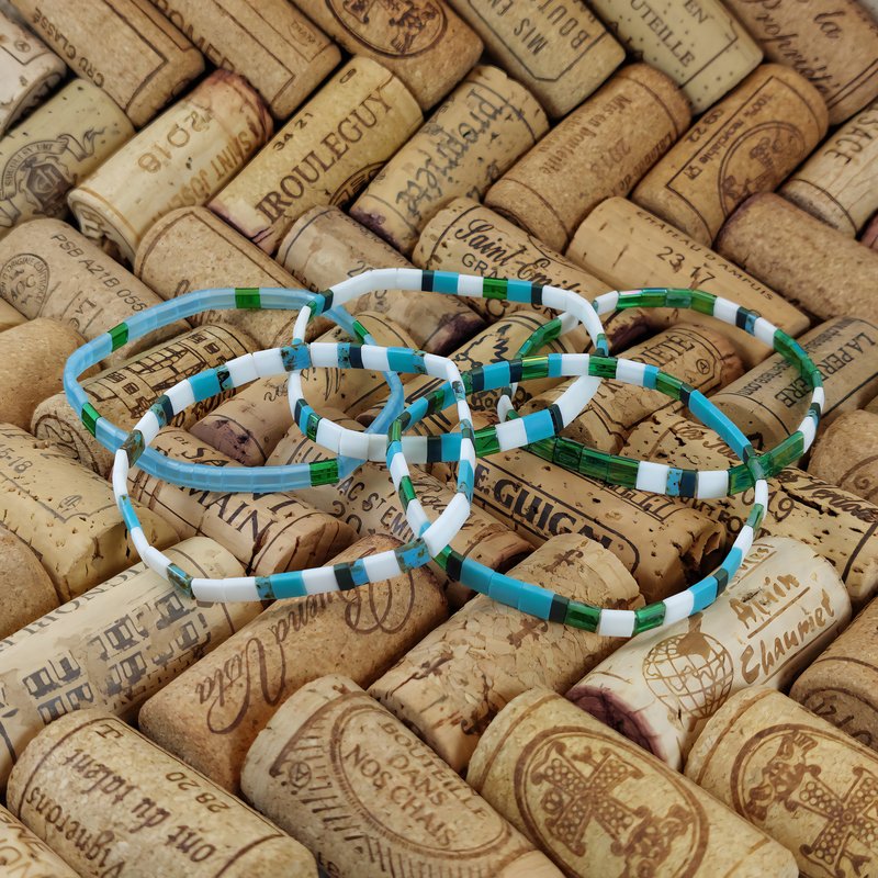 Saisissez la fraîcheur de l’ensemble FREEZE – Bracelets de perles plates RE•VE Originel™. Les nuances bleu glacier, turquoise et vert émeraude, rythmées de blanc et de perles marbrées, composent un contraste rafraîchissant qui illumine jean, chemise claire ou robe d’été.