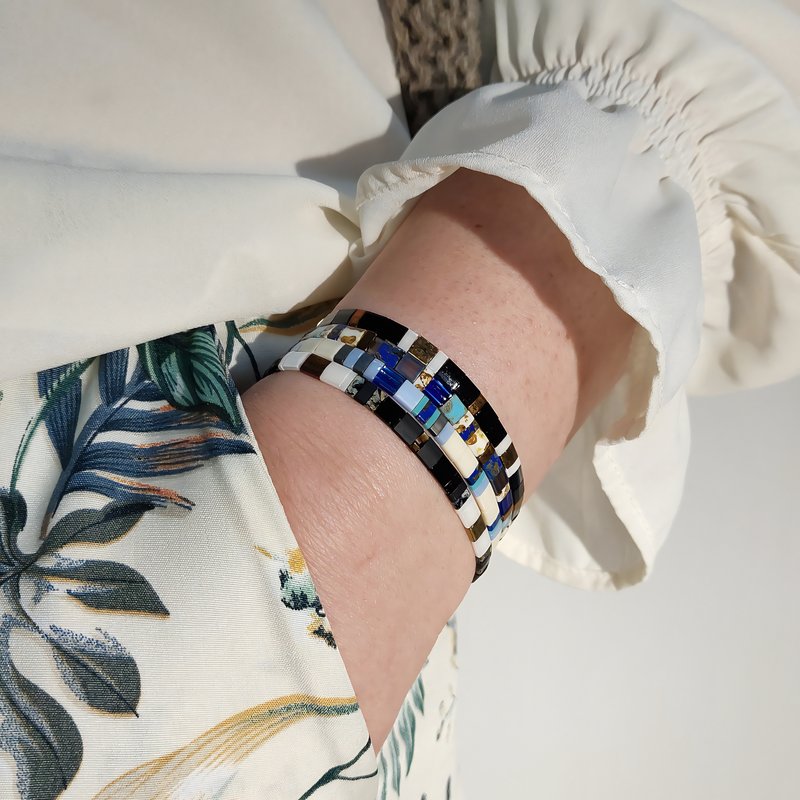 Les bracelets de cet ensemble présentent une combinaison harmonieuse de tons bleus, noirs, blancs, bronze et dorés, créant un look raffiné et moderne. Ils sont parfaits pour ajouter une touche de sophistication à une tenue décontractée ou pour compléter une tenue plus habillée.
