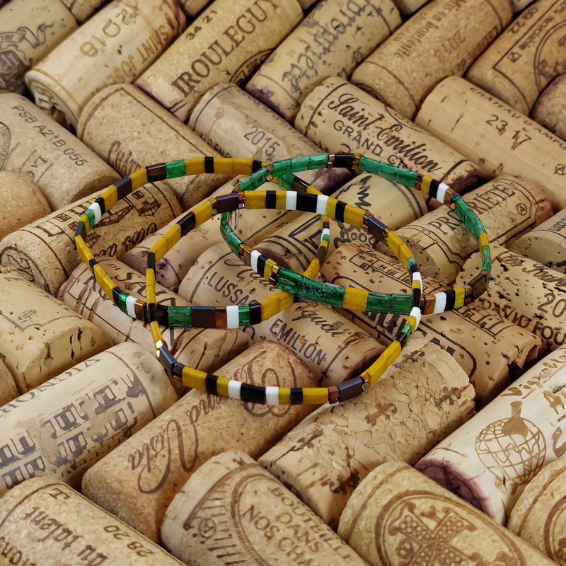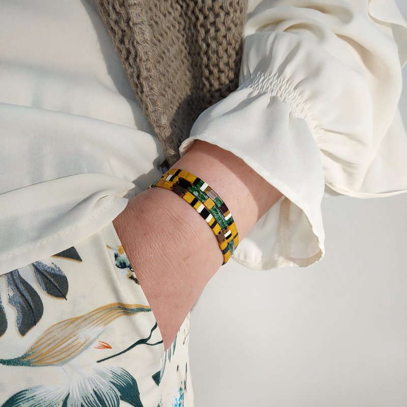 Captez l’énergie des forêts profondes avec l’ensemble JUNGLE – Bracelets de perles plates RE•VE Originel™. Le dialogue entre vert émeraude, jaune moutarde, noir et blanc, relevé de différentes nuances bronze, crée un contraste naturellement audacieux qui donne du relief à chaque tenue, du jean au blazer.