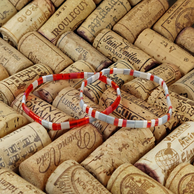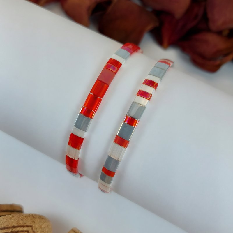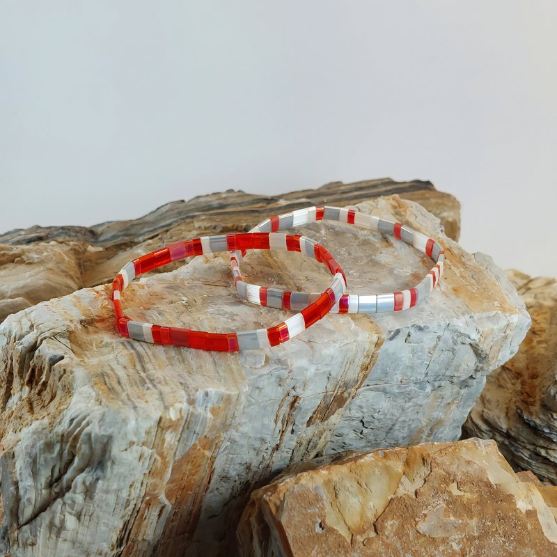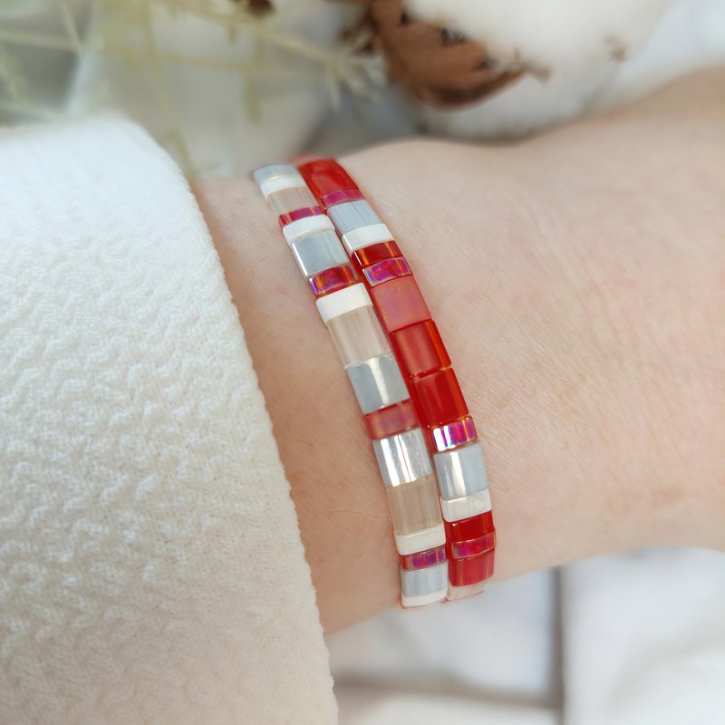 Le premier bracelet se distingue par ses nuances de rouge lumineux, ponctuées de touches translucides et rosées, évoquant la passion et l’amour. Le second, dans des tons de gris doux et minéraux, apporte équilibre et élégance, créant un duo harmonieux et raffiné.